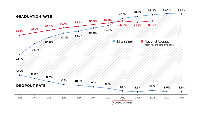 Mississippi’s graduation rate exceeds the latest national rate of 86.6% from 2021-22 reported by the National Center for Education Statistics (NCES). Historically, Mississippi’s public school students have achieved continued improvement. The statewide graduation rate was 74.5% in 2013, and the statewide dropout rate has decreased from 13.9% in 2013.